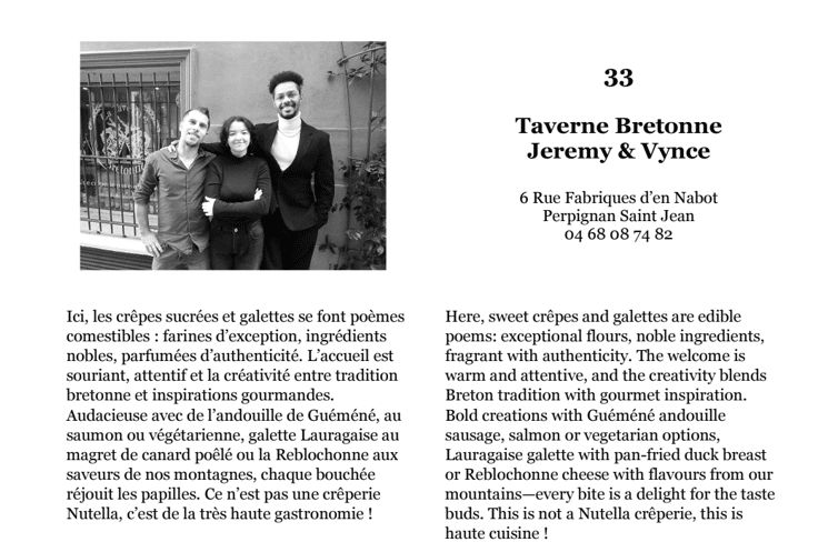 Si Perpignan se situe bien plus au sud que la Bretagne, vous pourrez tout de même trouver de vraies crêpes bretonnes dans notre carte. Vous vous laisserez peut-être tenter par une bonne galette bretonne nature ou avec de l’andouille de Guéméné au saumon ou végétarienne ? Comme nous aimons bien manger et proposer un large choix à nos clients, nous avons aussi imaginé d’autres recettes bretonnes pour satisfaire tous les gourmands. Nous vous conseillons, entre autre, notre galette Lauragaise au magret de canard confit ou la Reblochonne aux saveurs de nos montagnes.